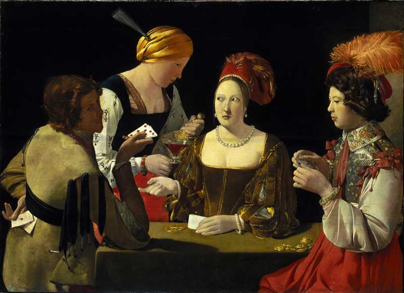 Georges de la tour était très riche et très économe… Au XVIIe siècle, les jeunes jouaient beaucoup aux cartes dans les tavernes…Le peintre a fait là une oeuvre éducative: « Prenez garde à la tentation, jeunes gens… Voyez où elle vous mène ! » Dans ce tableau, il n’y a pratiquement que des couleurs chaudes, mis à part le tapis et le rebord de la veste du « pigeon » qui reflète le vert du tapis.