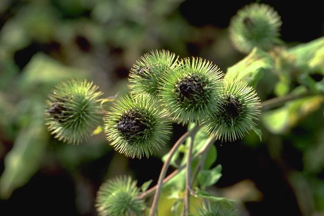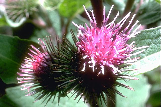 La bardane, ou glouteron, ou herbe aux teigneux, habite si près de nos maisons. Ses grandes feuille servent de parapluie aux enfants et ses fruits en petits capitules, munis de crochets, leur servent à se faire des décorations ou à bombarder méchamment leur voisin. Ces aiguillons à la fois souples et difficiles à détacher sont à l’origine de l’invention du velcro.
