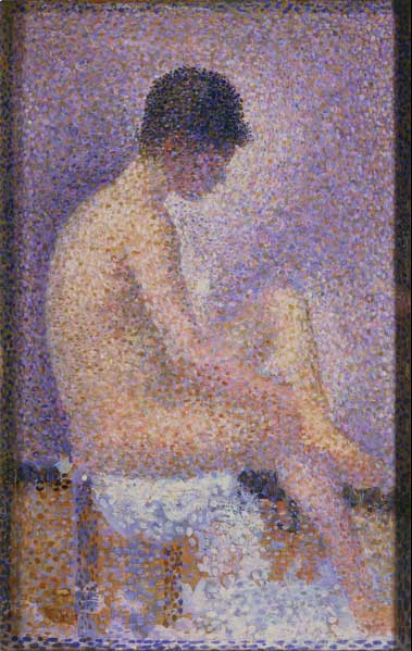 Les bleus et les ocres qui dominent ici, jouent le jeu de ce miroitement complémentaire et créent une lumière très particulière que Seurat n’a pas aménagée seulement en relation avec la direction de lumière ; craignant peut-être le manque de relief malgré l’assombrissement du visage penché, il a créé deux zones de lumière comme une sorte d’aura lumineuse autour du visage et de la jambe gauche du modèle, pour équilibrer cette lumière il a donc foncé celle qui touche le dos.