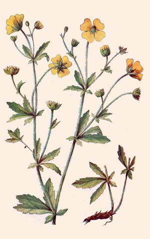 La quintefeuille,ou “main de Mars” ou “patte de pigeon”, Potentilla reptans, de la famille des Rosaceae, est une potentille rampante ; d’eurasiatique, elle est devenue cosmopolite et est très répandue dans notre hémisphère nord. Herbacée, cette vivace rampante a des stolons rougeâtres qui ressemblent à des lacets de souliers et peuvent atteindre 1 m de long.