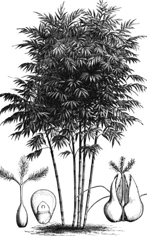 Le bambou, Bambusa vulgaris Schrad., de la famille des Poaceae, possède une tige souterraine, un rhizome. La tige est lisse, ramifiée et présente des articulations importantes: fistuleuse, elle est généralement cloisonnée au niveau des entre-noeuds. Les feuilles sont courtes, pétiolées, lancéolées. Sa floraison est irrégulière, elle est suivie de la mort de la plante. Le bambou est une plante herbacée ligneuse qui peut atteindre 8 à 15 m de hauteur pour un diamètre des chaumes de 5 à 10 cm. C’est un roseau exotique qui pousse très vite, parfois plus de 20 cm par jour. Le bambou est originaire d’Asie, mais il est désormais cultivé dans le monde entier à des fins ornementales.