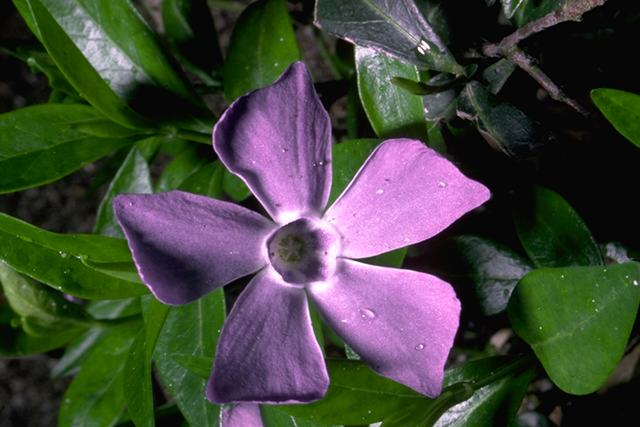 La petite pervenche ou bergère ou herbe à la capucine ou violette des sorciers, Vinca minor de la famille des Apocynaceae, est une plante vivace au feuillage persistant, spontanée dans toute l’Europe centrale et méridionale ainsi que dans le nord-ouest de l’Asie mineure, la petite pervenche pousse dans les bois, les haies, les talus et sur les rochers. Ses tiges rampantes peuvent atteindre un à deux mètres. Les feuilles sont opposées, lancéolées à elliptiques, glabres, coriaces, luisantes et de couleur vert foncé. Sur les tiges florifères, dressées et longues de 10 à 20 cm, poussent de jolies fleurs solitaires bleu céleste, blanches ou violacées, régulières et à 5 divisions. Le fruit est une capsule constituée de deux petits follicules renfermant chacun 3 à 6 graines.