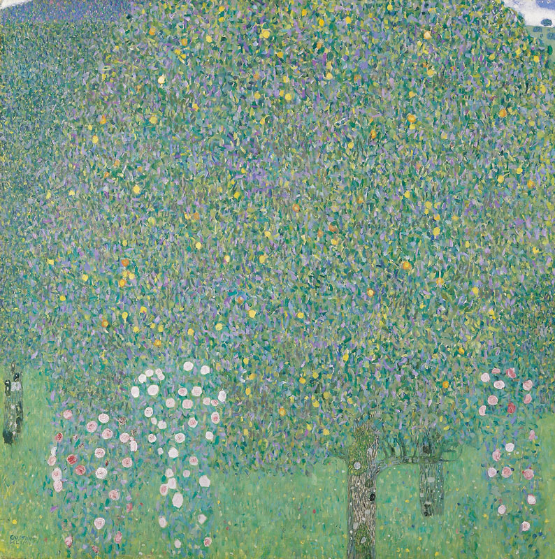 Les rosiers sous les arbres… Le fouillis de petits points donne une impression de mouvement, comme si le vent agitait les feuilles. Ce n’est plus vraiment du pointillisme, c’est du graphisme. On distingue les rosiers et les fruits dans les arbres. Un minuscule bout de ciel bleu en haut à droite du tableau indique la ligne d’horizon, très haute. Le peintre était sans doute sur une hauteur pour peindre cette cuvette de verdure.