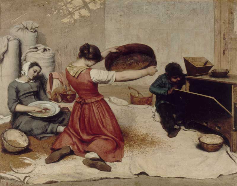 Le tableau Les cribleuses de blé de Gustave Courbet, peint en 1854 représente des femmes qui passent le blé dans un grand tamis pour séparer les bons grains qui tombent sur le tissu par terre. Ces femmes travaillaient toute la journée… et étaient épuisées. La mécanisation était encore rare en France.