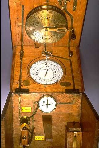 Télégraphe à deux aiguilles aimantées, de Wheatstone et Cooke de 1842 est le premier type effectif de télégraphe électrique à longue distance. Le courant électrique actionne les aiguilles qui indiquent les lettres et sont ensuite décodées.