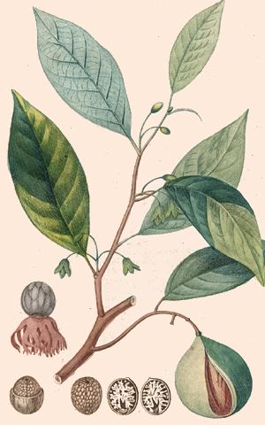 Le muscadier ou nux indicamacis, Myristica fragrans , de la famille des Myristicaceae est originaire des îles Banda aux Moluques. Cet arbre dioïque, d’allure pyramidale, atteint 10 à 20 m de haut. Ses feuilles simples et entières sont persistantes et alternes. Ses fleurs monoïques ou dioïques produisent un fruit globuleux charnu semblable à un abricot jaunâtre. Il s’ouvre à maturité en deux valves et libère une graine unique ovoïde de trois à quatre centimètres à son plus grand axe, ligneuse, très dure, de couleur brunâtre. Elle est entourée d’une sorte de résille charnue d’un rouge orangé brillant, le macis, qui est détaché et mis à sécher. De son côté la graine est séchée, le tégument externe brisé et éliminé, laissant le tégument interne adhérant à l’amande. Cette amande ovoïde est oléagineuse et son odeur, suave, se révèle lorsqu’on la râpe. Plante tropicale, le muscadier a été transplanté dans les deux hémisphères, dans les îles malaises et indonésiennes, dans l’île Maurice et à Ceylan. L’Indonésie et surtout la Grenade (Petites Antilles) en sont les plus gros producteurs.