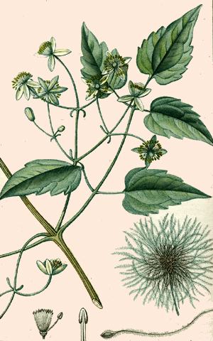 La clématite des haies ou viorne ou vigne blanche ou encore berceau de la Vierge, herbe aux gueux, viorne, Clematis vitalba L. de la famille des Ranunculaceae. En anglais, traveller’s joy. C’est une plante indigène dont les nombreuses appellations traduisent bien l’ancienneté des emplois populaires.