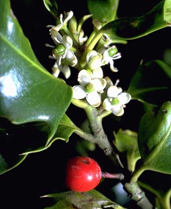Les fleurs sont en courtes grappes à l’aisselle des feuilles. Le houx est dioïque, mais il arrive que le sexe change d’une année à l’autre ; il est rarement polygame. Avec leur calice persistant et une corolle en roue à 4/5 pétales soudés entre eux à la base, les petites fleurs blanches du houx éclairent le feuillage sombre, de mai à juin.