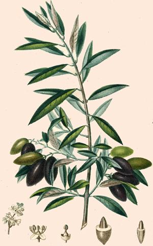 L’olivier ou arbre de Minerve, Olea europaea, de la famille des Oleaceae, est-il originaire du Bassin méditerranéen ou bien les oléastres (oliviers arbustifs sauvages du maquis) que l’on y trouve sont-ils une dégénérescence de l’arbre cultivé ? Sa culture existe depuis les premiers âges de l’humanité. Il peut parfois vivre jusqu’à 2000 ans mais ne résiste pas aux hivers trop froids. En Europe, la “zone de l’olivier” est strictement limitée au contour méditerranéen ; il pousse aussi en Asie et en Afrique.