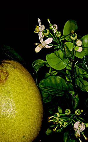 Originaire d’Asie, le pamplemousse fut importé à une date très ancienne en Inde où la culture modifia son fruit, primitivement immangeable, en différentes variétés à chair rouge, blanche, acide ou sucrée, insipide ou parfumée, à écorce amère ou douce. Des Indes, le pamplemousse se répandit en Amérique, introduit par un capitaine nommé Shaddock, nom qui le désigne encore aujourd’hui dans la langue anglaise. Le pamplemoussier ou pomelos, Citrus paradisi, de la famille des Rutaceae atteint 7 mètres, les fleurs, de forme semblable à celles de l’oranger sont blanches et odorantes, et d’une taille supérieure. Le fruit est généralement sphérique, recouvert d’une écorce ayant l’épaisseur d’un pouce, de teinte jaune pâle, toute parsemée de minuscules vésicules à essence. Il n’est pas rare d’en voir qui atteignent de 6 à 8 fois le volume d’une orange.
