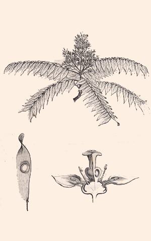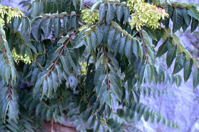 L’ailante est un arbre d’ornement, pouvant mesurer de 6 à 20m de hauteur, très commun dans les parcs et les avenues de nos cités modernes. Il a cependant un défaut : ses feuilles froissées et ses grandes grappes de fleurs verdâtres, qui fleurissent au mois de juillet, dégagent une odeur assez désagréable. Il se caractérise par ses longues feuilles alternées d’une soixantaine de centimètres, composées de 13 à 40 folioles larges et brillantes, et par son écorce gris-brun aux rayures pâles. En automne mûrissent ses petits fruits ailés de 4cm.
