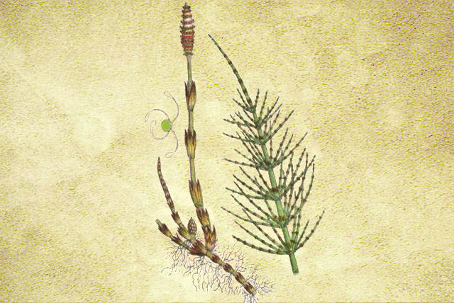 Feuilles nulles, remplacées à chaque nœud de la tige par une gaine membraneuse dentée ; tiges articulées, creuses, cylindriques, strictes ou sillonnées, simples ou à rameaux verticillés et articulés comme la tige :Sporanges placés et la face inférieure d’écailles peltées ayant la forme de clous et verticillées par 4-9 sur plusieurs rangs superposés qui forment un épi terminal cylindracé, sessiles, uniformes, uniloculaires, s’ouvrant en long par une fente; spores très nombreuses, globuleuses, libres, entourées chacun de 4 filaments élastiques (élatère), dilaté en spatule au sommet, d’abord roulée en spirale autour de la spore, puis se déroulant avec élasticité sous l’influence de la sécheresse.