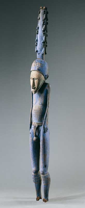 Cette sculpture vient de l’île de Malo…en Océanie. (un temps). Elle s’appelle Trrou Körrou ce qui signifie “celui qui est dressé devant vous et qui vous regarde”. Elle était posée devant “la Maison des Hommes d’un village” et imposait le respect du chef à tous les Vanuatu” … Est-elle bleue pour donner une peur Bleue aux Vanuatus?