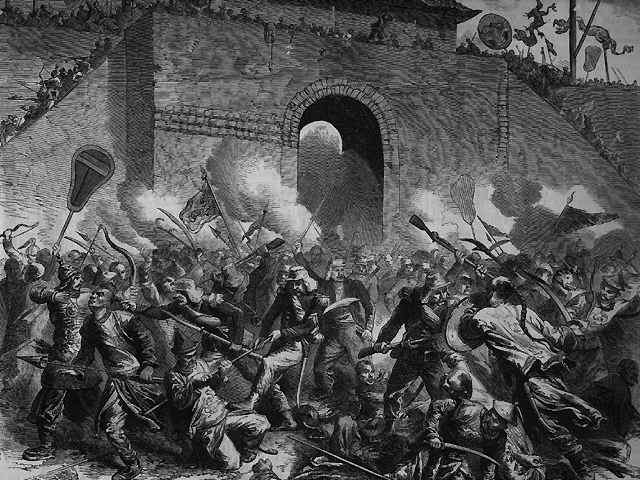 S’étend alors dans la Chine tropicale une des plus grandes insurrections de l’histoire : celle des Tan Ping qui abandonnent la natte, signe de l’asservissement aux Mandchous, instituent un régime communautaire, égalitariste et théocratique, puritain et féministe. Capitale : Nankin.