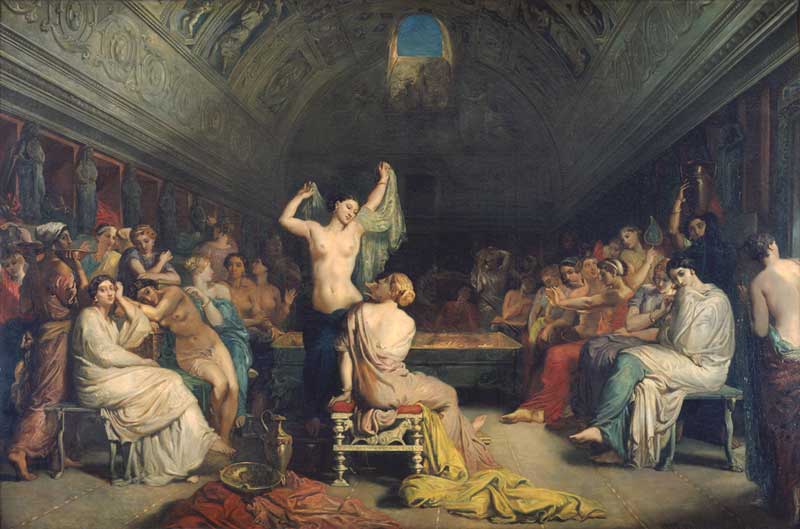 Héritier du néoclassicisme, Chassériau qui est allé à Rome et dans la baie de Naples en 1840-1841 s’inspire de la Rome antique. Mais on se croirait ici dans un scène de harem orientaliste telles celles que Delacroix peint au retour du Maroc.